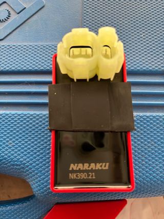 Componente electrónico Naraku NK390.21. - Carcasa negra con detalles rojos. - Conector de plástico amarillo.