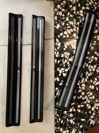 Embellecedores de puerta para BMW E46 con distintivo M. - Diseño deportivo en negro con detalles plateados. - Incluye tres piezas. - Dispone de unidades de puertas delantera y solo trasera izquierda -Son piezas totalmente originales