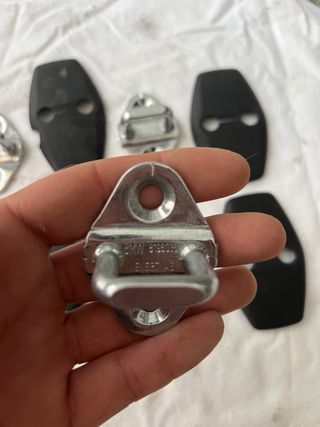 Set de 4 cerraduras para puertas de BMW. Incluye las piezas metálicas y las cubiertas negras. Totalmente nuevas y originales de BMW - Piezas metálicas con gancho. - Cubiertas de plástico negro. - Producto original.
