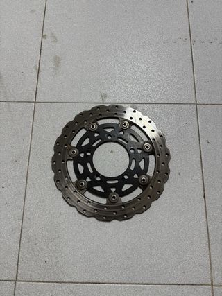 Disco de freno metálico para motocicleta. Presenta un diseño perforado para una mejor disipación del calor. - Material: Metal - Diseño: Perforado