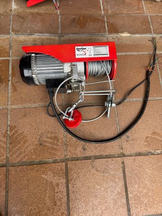 Polipasto eléctrico de la marca Berlan, modelo BSZ600A. Diseñado para elevación. - Carcasa de color rojo y gris. - Cable de acero enrollado. - Incluye gancho y polea.