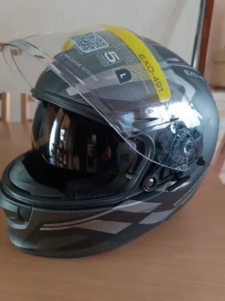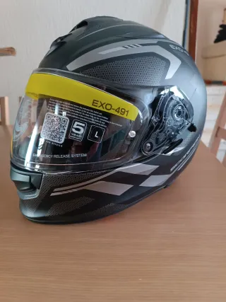 Casco de moto Scorpion EXO-491 con diseño moderno y detalles en gris y negro. Incluye visor transparente y sistema de liberación de emergencia. - Modelo: EXO-491 - Talla: L - Color: Negro/Gris - Cierre de emergencia en el visor