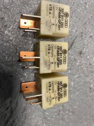 Conjunto de tres relés de 12V, referencia 357 911 253, fabricados en Alemania. - Marca: KTB - Referencia: 357 911 253 - Voltaje: 12V - Fabricado en: Alemania - Material: PA66-GF30