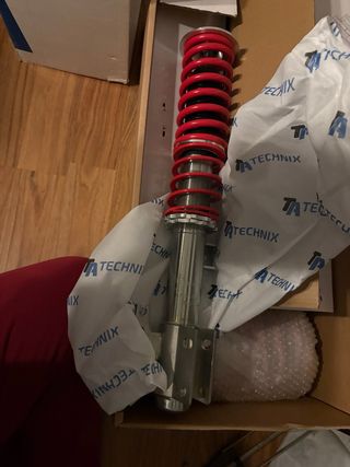 Juego de suspensiones roscadas para Opel Omega B. - Marca: TA Technix. - Incluye muelles rojos. - Cuerpo de amortiguador plateado.