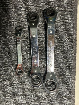 Conjunto de tres llaves de carraca de la marca Craftsman. - Fabricadas en EE. UU. - Diseño reversible. - Tamaños variados para diferentes necesidades.
