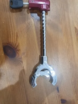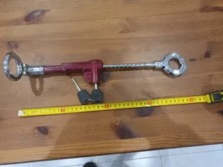 Antirrobo para volante de coche, diseñado para ofrecer seguridad adicional. - Mecanismo de cierre con dos llaves incluidas. - Construcción robusta en metal y plástico. - Diseño ajustable para diferentes volantes.