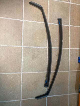 Juego de derivabrisas para coche. Protegen del viento y la lluvia al bajar las ventanillas. - Fabricados en plástico oscuro. - Diseño curvo y aerodinámico. - Incluye dos piezas.