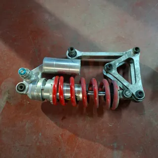 Componente de suspensión trasera para Yamaha R6. - Amortiguador con muelle rojo. - Brazos de conexión de aluminio.