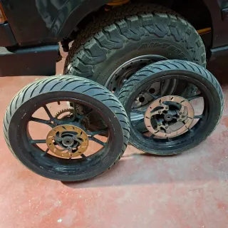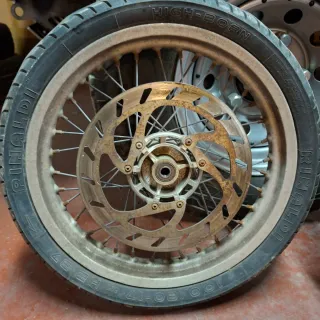 Juego de ruedas de 17 pulgadas para moto de estilo supermotard. Listas para montar. - Llantas de radios. - Discos de freno incluidos.