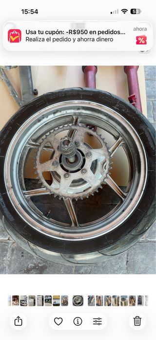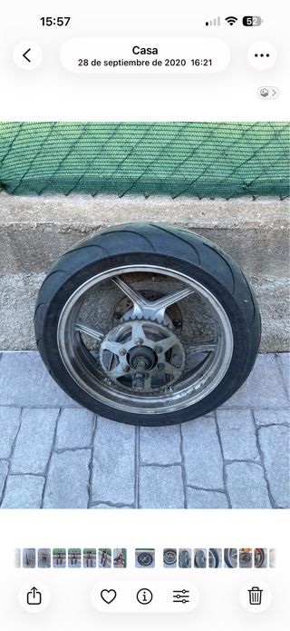 Rueda trasera para Kawasaki ER6-N. Se encuentra en buen estado. - Llanta de aleación plateada. - Neumático con banda de rodadura visible, el neumático está en buen estado pero es viejo - Incluye piñón. - Incluye disco de freno - Incluye eje rueda