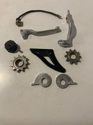 Conjunto de repuestos para Gas Gas TXT. - Palanca de embrague. - Palanca de freno. - Tapa de depósito radiador. - Dos tensores de cadena. - Dos piñones. - Protector de cadena.