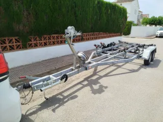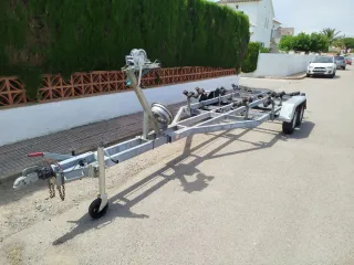 Remolque galvanizado para embarcaciones. Ideal para transportar tu barco de forma segura hasta 7'5 metros -Doble eje de 1000kg cada uno,2000 carga maxima - Estructura robusta de acero galvanizado. - Rodillos ajustables para diferentes tipos de casco. - Cabrestante manual para facilitar la carga. - Ejes con suspensión. - Luces traseras y laterales.