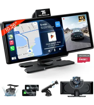 dimensiones del producto Tecxerllon Carplay modelo DC10Q5 son aproximadamente 24 x 10 x 4,7 cm (Largo x Ancho x Alto) 10,26'' Pantalla inalámbrica Carplay para Coche con dashcam 4K y cámara trasera 1080P, Receptor de Audio portátil con Carplay y Android Auto, navegación GPS, Airplay, Mirror Link 【4K Dash Cam + 1080P Rearview Camera】 Esta pantalla CarPlay de doble cámara cuenta con una cámara de salpicadero frontal 4K cristalina con un sensor G incorporado que detecta automáticamente las colisiones y bloquea las imágenes para preservar las pruebas críticas. La cámara frontal es ajustable. La cámara de visión trasera de 1080P se activ