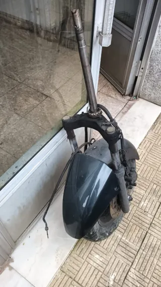 Conjunto de horquillas delanteras para Suzuki Burgman de carburación. - Incluye tijas y barras. - Frenos de disco y pinza. - Guardabarros delantero. - Cable retorno velocímetro. - La rueda ya no esta disponible, pero si el pasador con la tuerca.