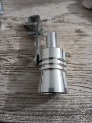 Dos silbatos universales que simulan el sonido de un turbo. Uno sin estrenar y el otro poco uso está muy bien. - Fabricados en aluminio plateado. - Diseño con bandas y cono. - Incluyen abrazaderas de montaje.