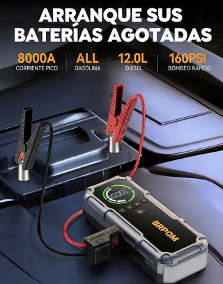 Corriente maxima de 8000A, Toda Gasolina o 12L Diésel encendiendo sin esfuerzo los motores de camiones pesados, SUV y vehiculos todo terreno Compresor de Aire conb 4 boquillas, 3 unidades de medida ajustables (BAR/KPA/PsI), con valor preciso y sistema de apagado automatico. Ofrece un inflado rapido de 45L/min, de 30PSl a 36PSl en 60s tambien como una bateria externa de 2680OmAh, capaz cargar telefonos y tabletas. Pantalla digital LED de 3,2 pulgadas muestra en tiempo real el estado de arranque y inflado y códigos de error cuenta con 10 mecanismos deproteccion automaticos y un boton de arranque forzado Incluye TODO de la 1a foto