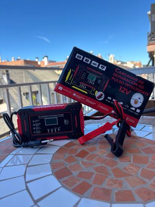 Cargador y reparador de batería inteligente de 12V para coche, moto y camión. Está nuevo y en perfecto estado. Carga todo tipo de baterías que no sean de litio. - Carga baterías de 12V. - Adecuado para coches, motos y camiones. - Sistema de carga por pulso inteligente. - Incluye pinzas. * 🛠️ Función de Reparación Automática: Olvídate de las baterías descargadas; este cargador de batería coche incluye una función inteligente de reparación automática que prolonga la vida útil de la batería. * 📊 Pantalla LCD Informativa: Con su pantalla LCD de fácil lectura, mantén el control total del proceso de carga, voltaje y diagnóstico de batería