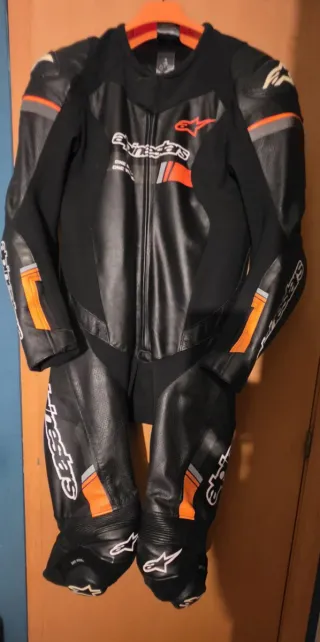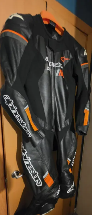 Mono de cuero Alpinestars en color negro con detalles en naranja y gris. Diseñado para motociclismo. Traje De Cuero Modelo "GP Force Chaser 1 Pieza" Como nuevo, sin roces