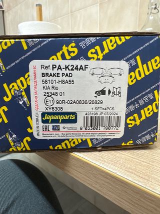 Pastillas de freno delanteras Japanparts. - Referencia: PA-K24AF - Modelo: 58101-H8A55 - Compatibilidad: KIA Rio - Homologación: E11 90R-02A0836/26829 - Código: XY6308 - Set de 4 piezas - Fecha de fabricación: 07/2024