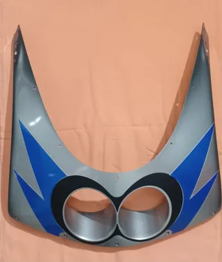 Carenado frontal para motocicletas Derbi GPR-50 o Cagiva Mito-50. Presenta un diseño llamativo con detalles en azul y negro sobre fondo gris. - Diseño tipo ojos de búho en la zona de los faros. - Detalles gráficos en forma de rayo en color azul. - Acabado en pintura gris metalizada.