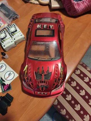 Carcasa de coche teledirigido de gasolina con diseño deportivo. - Color rojo metálico. - varias llantas para su cambio. - Inscripción KEY en la parte superior y frontal. - Más varios artículos de repuestos