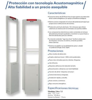 Sistema de protección contra hurtos con tecnología Acustomagnética. - Consumo energético reducido (menos de 50 W/hora). - Alarma sonora integrada en la base del pedestal. - Protección anti hurto de hasta 1,8 m de paso. - Componentes electrónicos contenidos en la base del pedestal. - Función tags-too-close para detección de etiquetas cercanas. - Sistema escalable (Single, Dual, Split). - Altos niveles de detección. - Amplia cobertura hasta 1,80m entre pedestales. - Etiquetas adhesivas de reducido tamaño. - Desactivación a distancia. - Central electrónica integrada. - Instalación rápida y sencilla. - Aviso sonoro y luminoso. - Bajo c