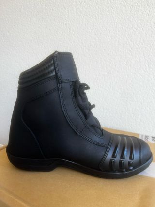 Botas de motorista de cuero de la marca italiana Biesse. Talla 39. - Diseño de caña alta. - Cierre con cordones y velcro. - Detalle tricolor en el lateral.