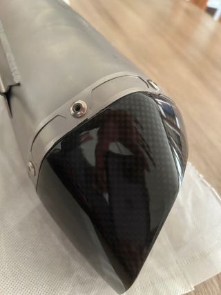 Sistema de escape para motocicleta con acabado en carbono. - Diseño deportivo y ligero. - Materiales de alta calidad.