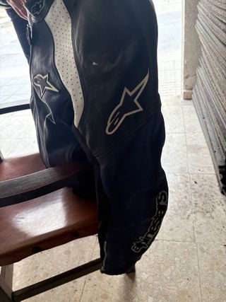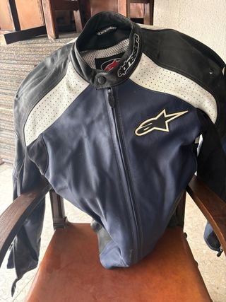 Chaqueta de motorista de la marca Alpinestars. - Diseño en cuero negro y azul. - Paneles perforados en blanco. - Logo de Alpinestars en el pecho.