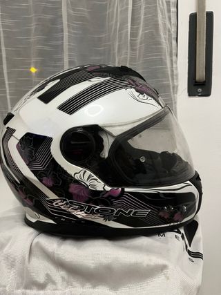 Casco de moto con un diseño llamativo y femenino. - Diseño floral en tonos morados y negros. - Acabado brillante. - Visera trasparente . - Talla S - Incluye funda protectora con logo. - Unica pega almohadillas un poco descastadas , lo normal del uso...