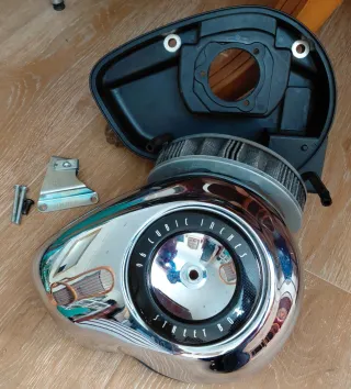 Filtro de aire oroginal cromado para Harley Davidson. - Diseño twin cam 96 Cubic Inches Street Bob. - Acabado brillante. - Incluye carcasa negra y filtro.