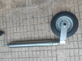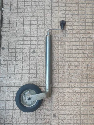 Componente para remolque con rueda y manivela. - Rueda de goma. - Estructura metálica. - Manivela con empuñadura negra.