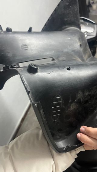 Pieza de plástico negro para scooter. - Diseño curvo y ergonómico. - Superficie lisa con algunos detalles de uso. - Incluye orificios para montaje.
