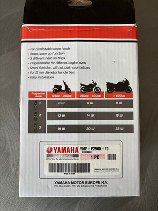 Puños calefactables para moto o scooter. Son originales de Yamaha pero se pueden utilizar en motos de otras marcas, ya que también tienen conexión directa a batería. Adicionalmente se adjunta adaptador para conector específico Yamaha (para que funcionen con el contacto) y toma de corriente formato mechero. Tienen muy poco uso por lo que están en perfecto estado. Se incluyen instrucciones de montaje. En la última foto se puede apreciar el precio oficial nuevos.