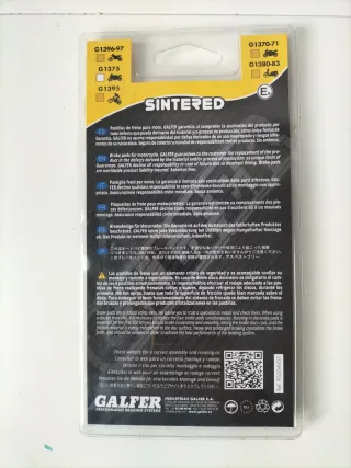Pastillas de freno Galfer Sintered para scooter. - Compuesto Sintered. - Homologación 90R E4. - Referencia FD 3456 1380. - Fabricadas en España.