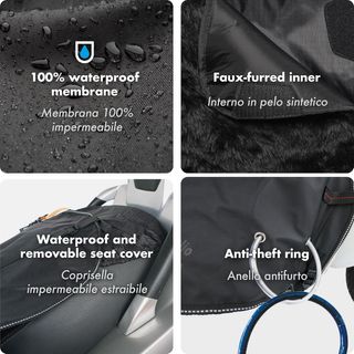 Manta cubre piernas universal para scooter. Protege del frío y la lluvia. - Material impermeable. - Diseño adaptable a la mayoría de scooters. - Incluye cintas de ajuste.