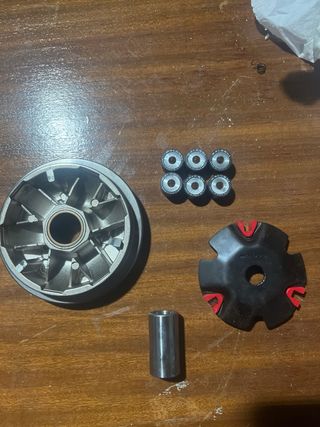 Kit de embrague Varioplus para scooter. Incluye varias piezas para su instalación. - Variador con rodillos. - Muelle de embrague. - Campana de embrague. - Poleas y otros componentes.