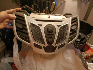 Consola central para Ford Fiesta MK7 del año 2010. Pieza color plateado brillante y negro con rejillas de ventilación integradas y panel de control. - Panel frontal con botones. - reproductor