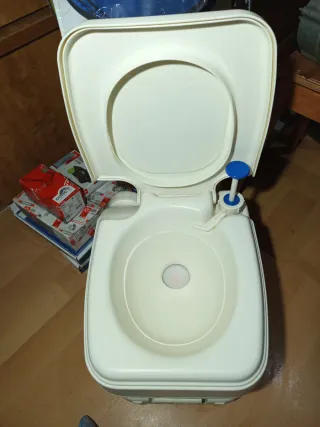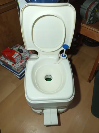 WC químico portátil, ideal para camping o viajes. Su diseño compacto lo hace fácil de transportar. - Tapa abatible. - Bomba de agua integrada. - Depósito de residuos.
