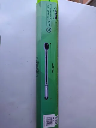 Llave dinamométrica JBM con un rango de 42-210 Newton metros y un tamaño de 1/2 pulgada. Incluye estuche. - Rango de torsión: 42-210 Nm (4.28-21.4 kgm). - Tamaño del cuadro: 1/2. - Longitud: 470mm. - Número de dientes: 72. - Referencia: 51127.