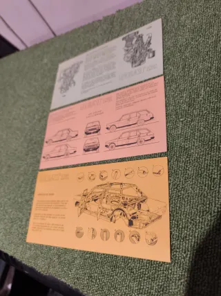 Conjunto de cartulinas con ilustraciones del Seat 131. - Incluye diagramas del motor. - Muestra diferentes vistas del coche. - Detalla la estructura del chasis.
