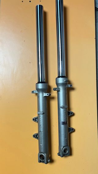 Horquilla / suspensión delantera SIN tija para Honda Hornet CB600F 1998 - 2004 La moto tenia 42.000km NO están dobladas NO tienen oxido NO fugan aceite Funcionan perfectamente Una de ellas tiene unas marcas donde va la tija, (que no afecta en nada a la suspensión) y unas marcas en la botella, se aprecian en las fotos.