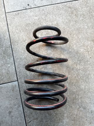 Muelles de suspensión para BMW Serie 1. - Color negro con detalles en rojo. - Pintados de negros para la ITV. - Bajan entre 4 cm y 4,5cm - Dureza buena ni duro ni blandos - Se quitaron por venta de vehículo.