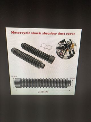 Fuelles para las horquillas o suspension delantera. Ideal para motos clasicas y modernas. Estan por estrenar. Las medidas son: 240-260 mm de largo. 27-33 mm barra. 45-50 mm botella. Consultar otras medidas. Consultar medidas, hay varios modelos. 25-45-190 (20€) 27/30-45/47-190/200 (20€) 28-45-195 (20€) 28-45-220 (20€) 30-45-190 (20€) 30/32-45/47-200 (20€) 27/30-45/47-220 (22€) 30-47-200/220 (22€) 27/33-45/50-240/260(23€) 35-50-240 (23€) 33/40-55/58-240 (23€) Moto clasica, trial, cross, enduro. montesa, derbi, puch, bultaco, gas gas, cota, sherko, beta, rieju, yamaha, hona, ktm, indian, harley,triumph, etc.... No preguntar por mod