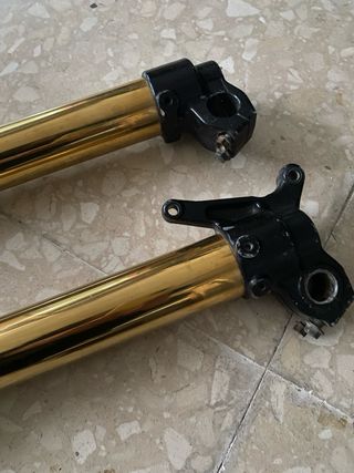 Par de horquillas WP Suspension para moto. Presentan un acabado dorado en la parte superior y negro en la inferior. - Marca: WP Suspension - Montadas en una Yamaha. No se entrega con nada mas que no sea lo que se muestra en la imagen. - Color superior: Dorado - Color inferior: Negro - Medidas: Botella dorada: 49mm / Botella de la platina: 54mm