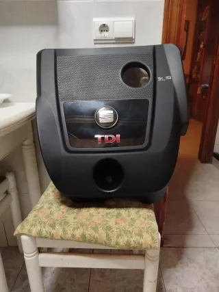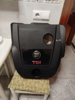 Tapa de motor para Seat León FR Mk1 con distintivo TDI. - Color negro. - Placa frontal plateada con logo de Seat y TDI. - Esta en buen estado. - Tiene los amarres perfectos (Engancha bien)