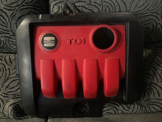 Tapa de motor para Seat León 2 con motor TDI. Pieza de plástico negro y rojo con el logo de Seat y la inscripción TDI. - Diseño con cuatro relieves. - Orificio circular superior.
