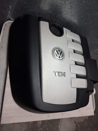 Tapa de motor para Volkswagen Touareg modelo 7L con motor R5 TDI. Pieza de plástico negro y plateado con el logo de Volkswagen y la insignia TDI. - Logo de Volkswagen. - Insignia TDI.