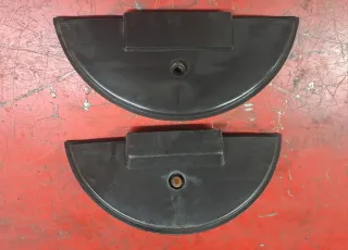 Embellecedores de plástico negro para la tapa de la rueda de repuesto de una Vespa. Precio por unidad. Valido para modelo con y sin bateria. Diseñado para cubrir y proteger la rueda de repuesto. - Material: Plástico. - Color: Negro. - Forma: Semircircular con una pestaña superior.