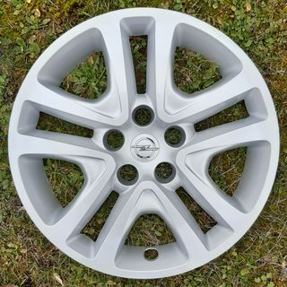 Tapacubos original de OPEL ASTRA K (2015-2021) para llanta 16" en muy buen estado. 1 UNIDAD. Con su aro y sus patillas de anclaje, se ha repintado y barnizado el borde, por raspones.